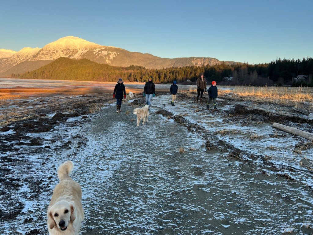 Is that right? I need help counting napkins and plates in order to set the table, and exactly how many need a seat for dinner. And we aren’t even all here yet.Our oldest daughter and her family won’t arrive until Christmas Eve on the ferry from Juneau -and yes, thank God it’s the Kennicott– a big one- and unlike the trusty little LeConte, will not be canceled due to high winds and rough seas. Speaking of rough seas, everyone is talking about the cold. The predictions are for a brutal deep-freeze beginning tomorrow through Wednesday. Highs in the minus digits– which is really rare here. By Thursday it should warm up and snow. We can be indoors this weekend at the school basketball games (the women’s choir sings The Star Spangled Banner tomorrow) and the Tinsel and Tidings variety show is Sunday at 2pm in the Chilkat Center. Suzy and her crew are working hard to make the holiday magic happen.