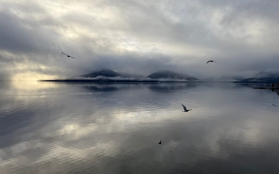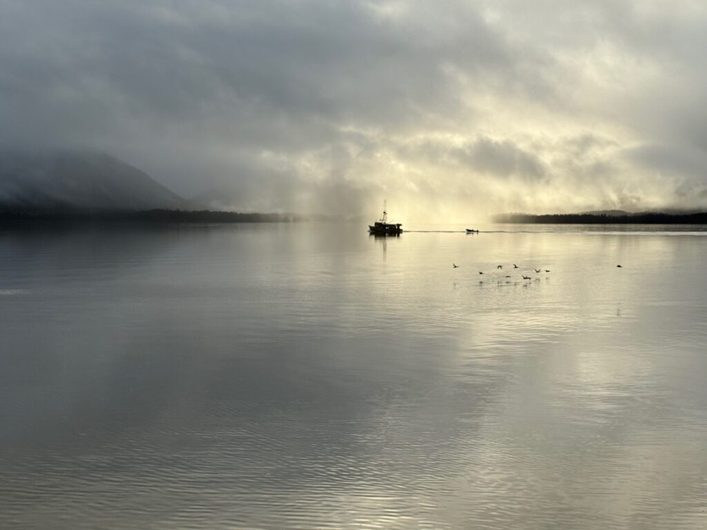I was having lunch when I read this line, and heard a gull, and I looked up and saw the birds, and the sea and the sky and I had to step out on the deck for a closer look, and then that boat came by and I thought: Holy cow. Thank you. This is what I was born today to see– and now I’m giving it to you. Pay attention to shards of light, to grace, to laughter. If you don’t look for them you may not find them.