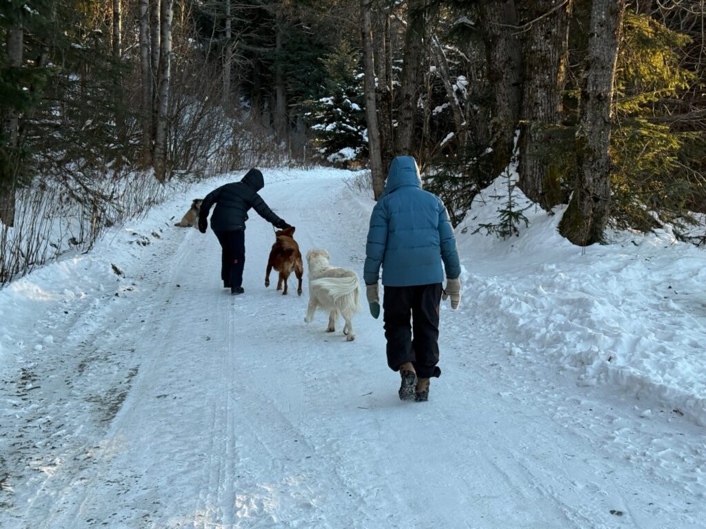 On our walk this morning down River Road and more out of the wind than the nearby beach, the low, low sun hit us right in the eye. It was ten o’clock. We three stood without blinking, relishing the brightness in the cold– soaking the light into our brains, our bodies, our souls. It was like a cold, cold glass of lemonade on a hot summer day. We all agreed we needed it. The sun sets behind the mountains now by one o’clock. Then the world is gray, blue and pink.
