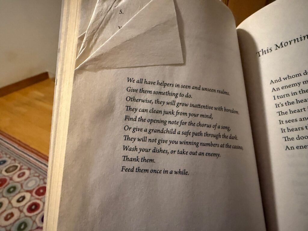 While making jam thumb prints for tomorrow’s holiday bake sale at the library, I read this thought from Joy Harjo, in her book of poems, Conflict Resolution for Holy Beings and I thought it was perfect- just perfect. Angels, like dogs and like people, need something to do–