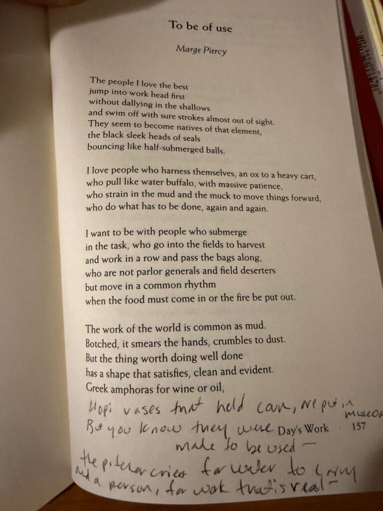 Since all of this reminds me of the joy of being useful, in our own ways, where we are — here is one of my favorite poems, “To Be of Use”, by Marge Piercy. I couldn’t get it all in one photo, so I scribbled the last stanza—