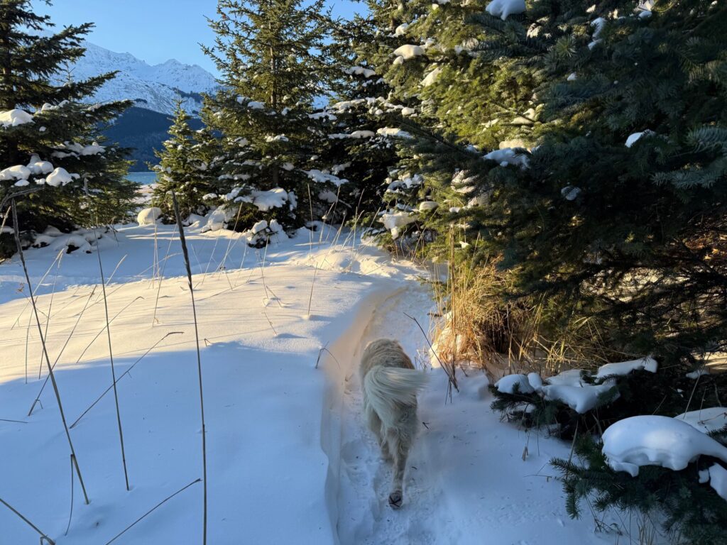 I walked today almost alone,– just the dogs and me– in circles, with my back to the wind down on the beach, and then into the wind in protected woods. I did this for an hour in between work or chores or choices or whatever it is I do all day– looping, marching, and opening my eyes and lungs into the bright hustle of the frozen windy beach, and then more slowly, in the silent woods– well, except for the wind, and the squeak of my boots on the snow, a small plane bouncing into the northerly toward the airport, a car out on the road, just one, in an hour. A pair of eagles whistling.