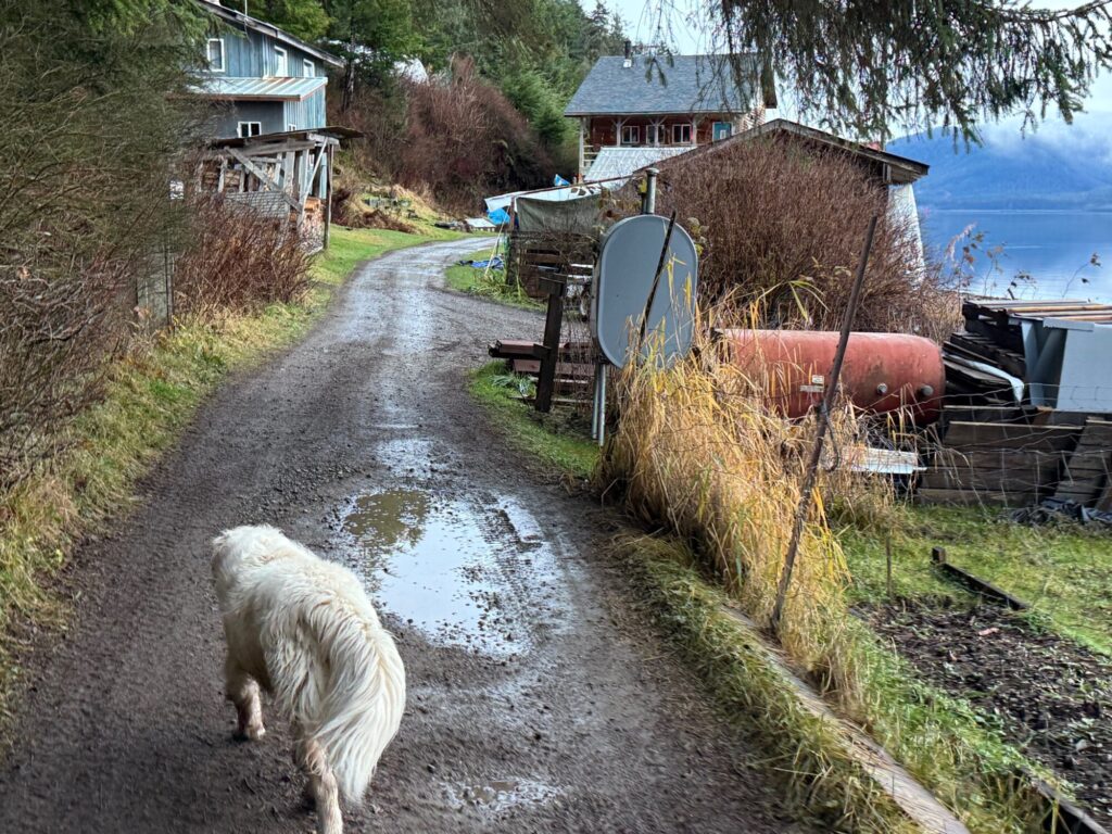 My afternoon dog walk out West Tenakee Avenue usually takes me to Rie Munoz’s grave. Sometimes I hike longer, down past Joanie’s and through the woods, especially in the summer when there is more daylight. I am a woman of routines and I like walking the same route and turning around at the same place. Yesterday when we chatted with Rie the dogs did a little dance and then rolled.