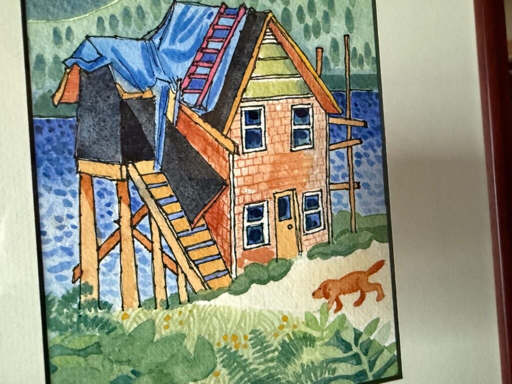 Although, Rie would have enjoyed this story. The wonderful, famous Alaskan artist captured the sometimes absurd, always joyous moments of life in this place. Plus she liked dogs. Her pictures make you smile, and although we only met formally a few times, I feel a kinship. Her paintings make me want to write something for her. Her friend Olaf has a headstone next to Rie’s. We never met, but I say hello to “Ole” too. Teresa walks with me most days and told me that’s what he was called. She also said they made a lot of sauerkraut back in the day with the school kids when she was the teacher because he had a lot of old crocks.