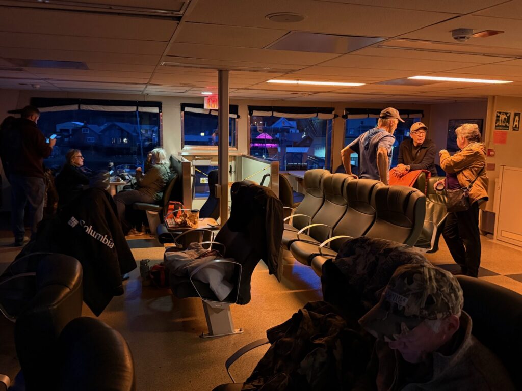 I’ve been on rougher ferries, and I don’t think anyone puked, at least not in public, and once I realized that my efforts to send you a note were futile, I had fun doing what we always do on the 4-5 hour run to town, visited with friends in the lounge and the cafeteria, read, dozed. Looked out the window into the darkness.