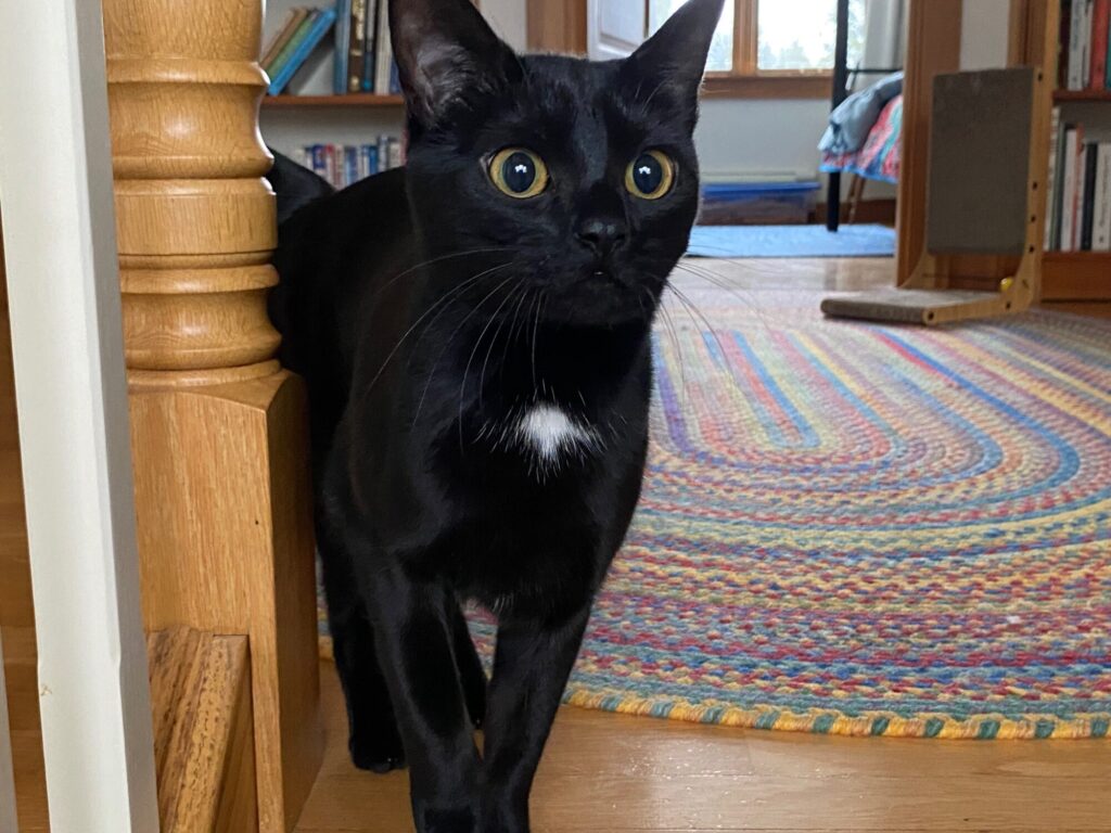The dogs are a little afraid of her. The cat, I mean, not Ivy. And so far the cat, not Ivy, has spent all of her time upstairs. With Ivy at school she will no doubt venture down– I can hear her calling now. I will do my best to remember exactly (I hope) how nutty it was when a tiny black cat subdued two large golden retrievers and took over our house.