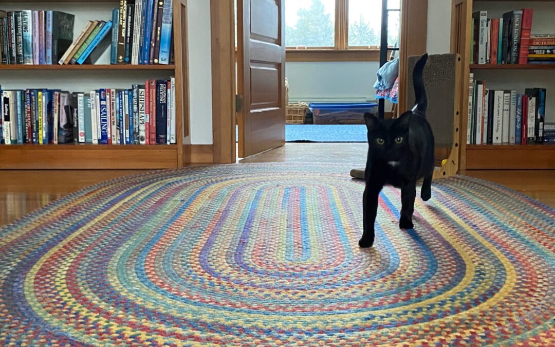 I was worried about taking Kit Kat from their house to ours without a kennel. I imagined the escape, the kitty lost in the snow. The search. Will she be lost or found? You know how it is. I loaded my car with Ivy’s stuff and the cat accessories, then opened the back door and Ivy dropped Kit Kat in a shopping bag and dashed for the car. Kit Kat was unfazed. She purred on the ride to our house. “Are you moving in for six months?” Chip said as we carried duffels, blankets, stuffed animals, books, back packs and the cat-scratch toy, cat food, her dishes– a litter box– all inside.