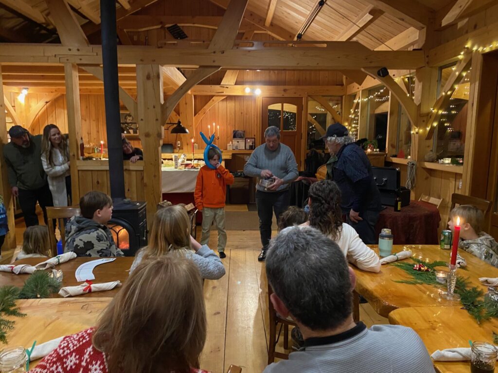 There were many levels of magic tonight– this community, family, friends, the warm wood lodge, the starry lung-grabbing cold night, the food – salmon and cookies and salads and wine in mason jars– the kids from 6 months to seventy-something-I’ll-never -tell–