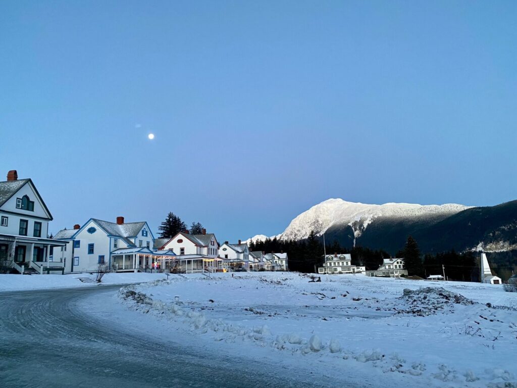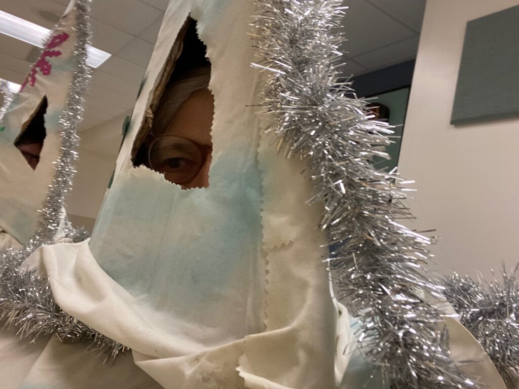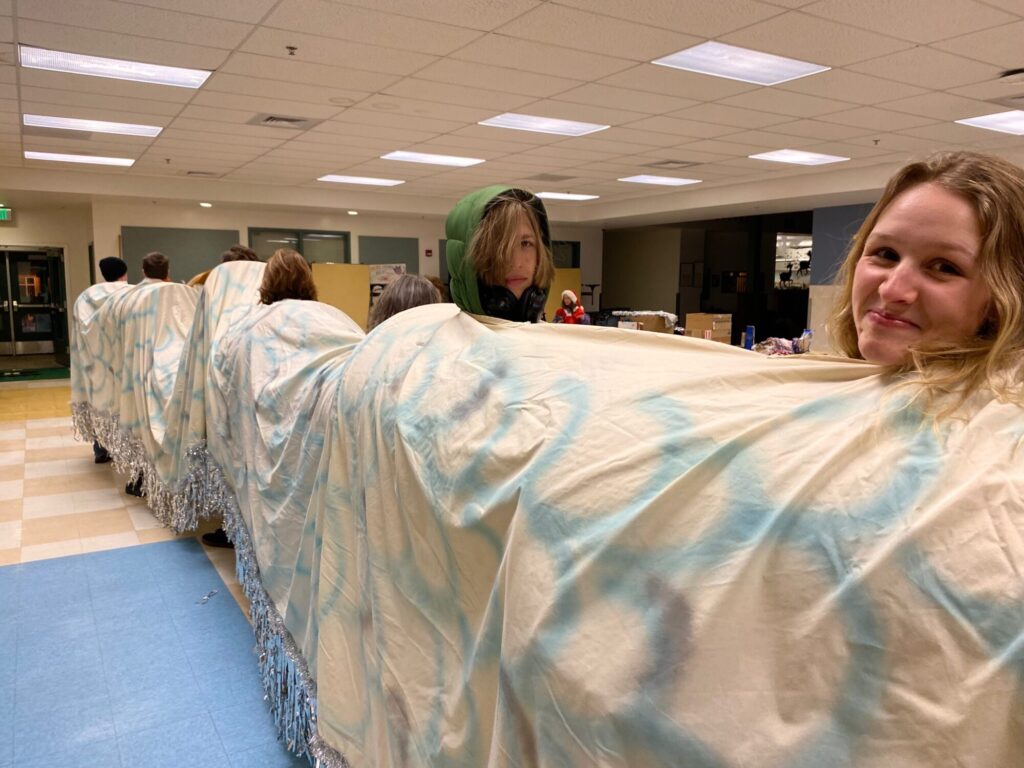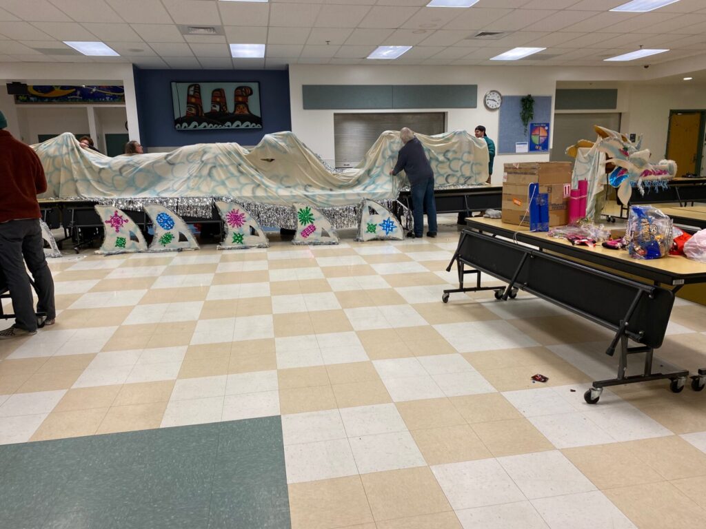 The kids all left at 3 for stories with Mrs. Claus at the library followed by the parade at 4. Chip walked the dogs and I picked the house up like a wild woman for a half-hour, and headed over to the school to put the snow dragon together. I love that ridiculous, tinsel-fringed dragon. Traditions require effort, and I am all about doing whatever it takes to maintain this whacky and wonderful Haines one. I really, really wanted my grandchildren to see our dragon weave and roar and blow flour smoke down Main St. on a dark December afternoon. I don’t think it would be Christmas in Haines without the dragon, and after 32 years working with it, I’m an expert. I quit actually being inside of the dragon a few years ago– It’s very difficult. The shell is heavy and you can’t see anything. Dragoneering is a young person’s game. But of course I agreed to stage it in the school cafeteria and coach the newest crew.