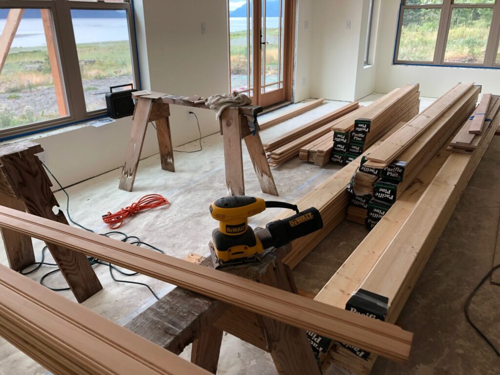 I am wondering what we were thinking fixing up the old garage next door and turning into a little house. Was all this wood trim (which I will sand and stain) my idea? Yes, indeed it was.