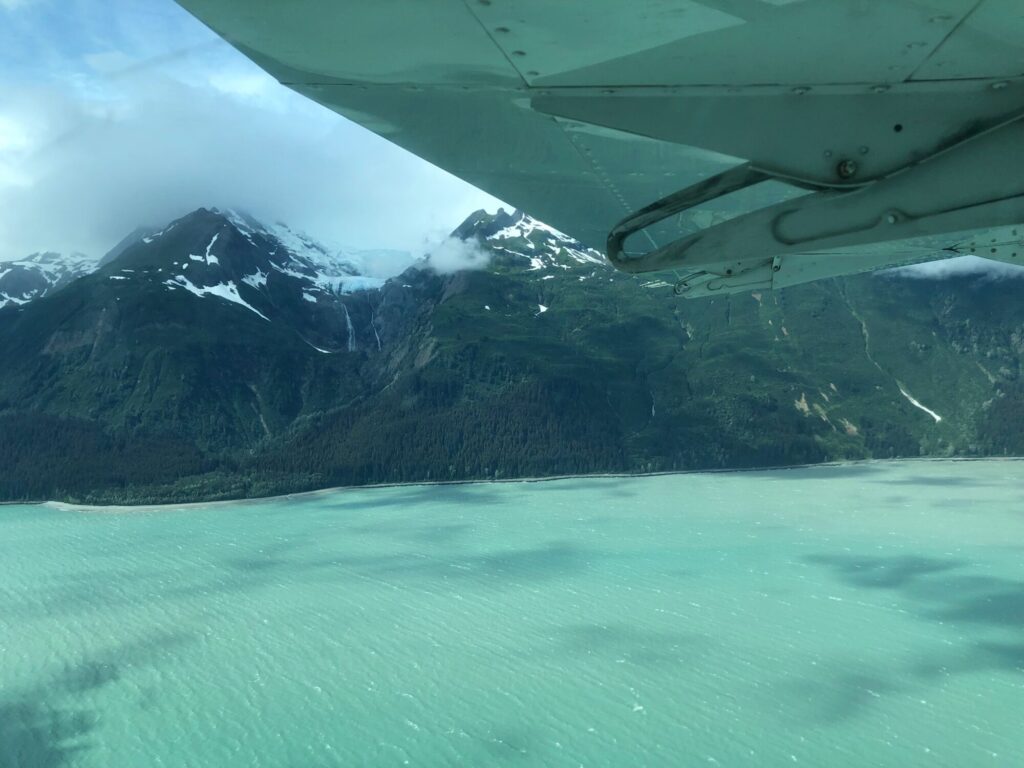 I woke up unable to step on my foot at two in the morning. Actually, the smoke alarm woke us up. There wasn’t a fire, it was that slow beep from a dead battery. The kind that almost allows you to ignore the chirping until it starts again. ( I counted, one-one thousand, two-one thousand..) Still, it was better than last week when I was in a dorm at UAA designed for a handicapped occupant, so the light was on a motion sensor, and everytime I rolled the room went bright as only an institutional dormitory can. By the third or fourth time I was laughing out loud. I’d close my eyes, and will myself to be still as a corpse, like at the end of yoga, but as soon as I’d doze I’d thrash and suddenly I’d see the light, and it was not one that I wanted to. But I did have a gorgeous flight home from Juneau to Haines– the green -blue water looked like the Caribbean.